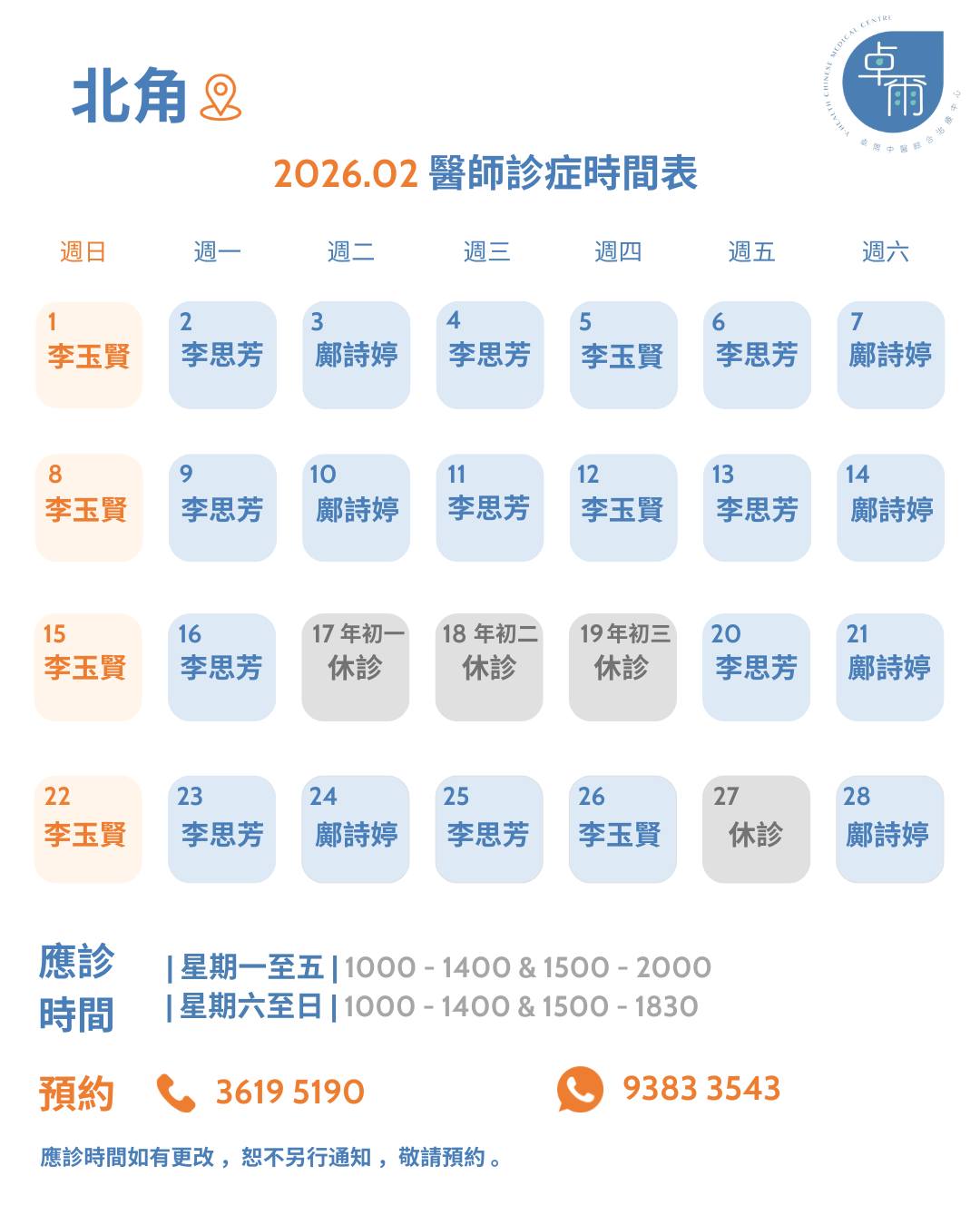 北角診所2月應診時間表